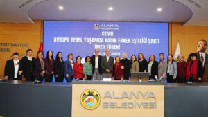 Alanya’da kadın-erkek eşitliği için tarihi bir adım atıldı. CEMR Avrupa Yerel Yaşamda Kadın-Erkek Eşitliği Şartı için Alanya Belediyesi Meclis Salonu’nda gerçekleştirilen imza törenine, Alanya Belediye Başkanı Osman Tarık Özçelik, Alanya Kent Konseyi Başkanı Nurhan Özcan, siyasi partilerin kadın kolları başkan ve temsilcileri, kadın dernekleri, sivil toplum kuruluşlarının temsilcileri ve çok sayıda davetli katıldı.