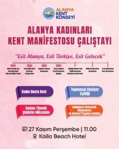 Alanya Kent Konseyi, kadınların kent yaşamında daha güçlü, daha görünür ve daha eşit bir konuma ulaşması için önemli bir adım atıyor. “Eşit Alanya, Eşit Türkiye, Eşit Gelecek” vizyonuyla hazırlanan Alanya Kadınları Kent Manifestosu Çalıştayı, 27 Kasım Perşembe günü gerçekleştirilecek.